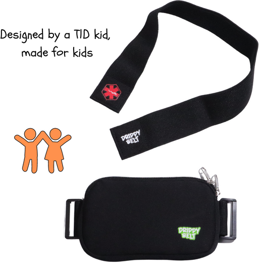 A waist belt crafted by a T1D child for fellow Type 1 diabetic children requiring medical device storage for phones and insulin pumps.